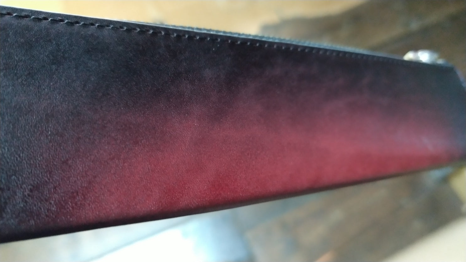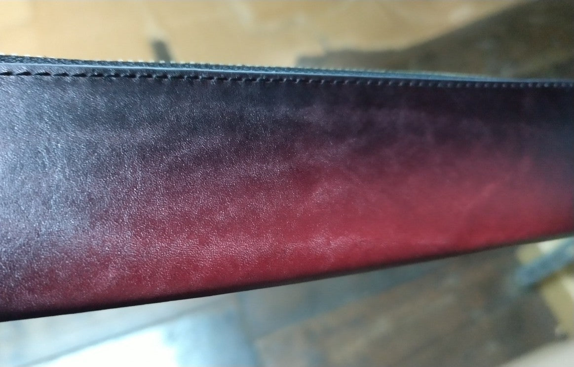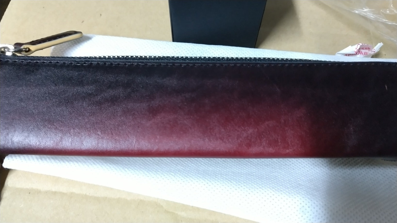 裁断したパーツごとにグラデーションして、切り目はベージュの目止め液を塗り、内側にはチョコ色の生地を使っています。 ※ 箱付き