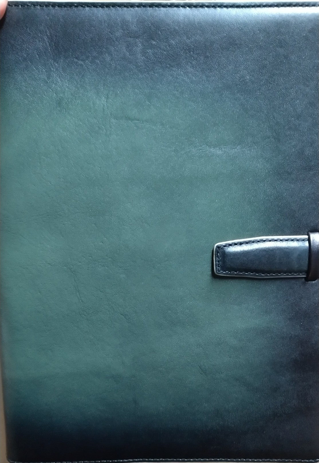 裁断したパーツごとにグラデーションして、切り目はベージュの目止め液を塗り、内側にはチョコ色の牛革(一部)を使っています。