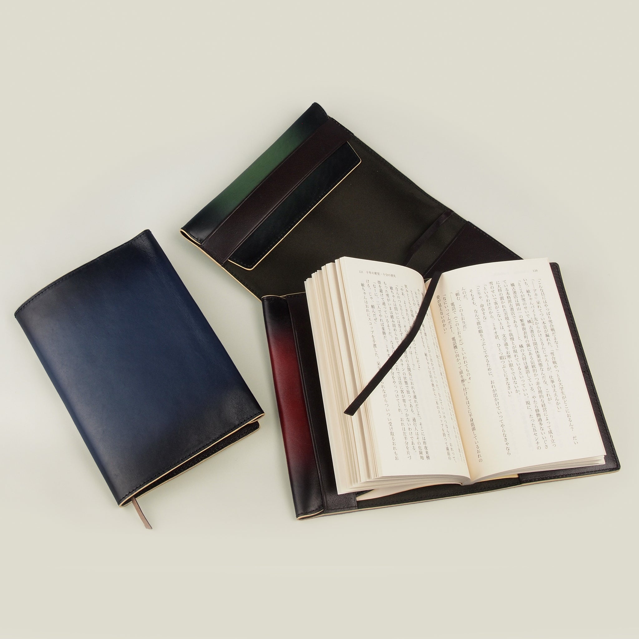 牛革製のブックカバー(文庫本サイズ)。ページ数の多い文庫本にも対応。