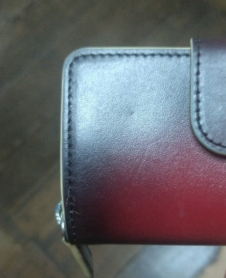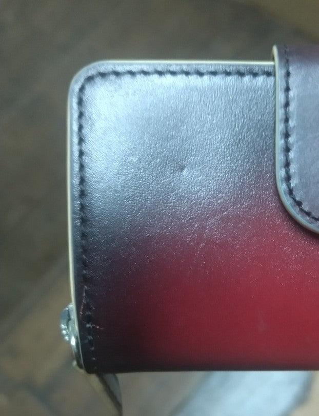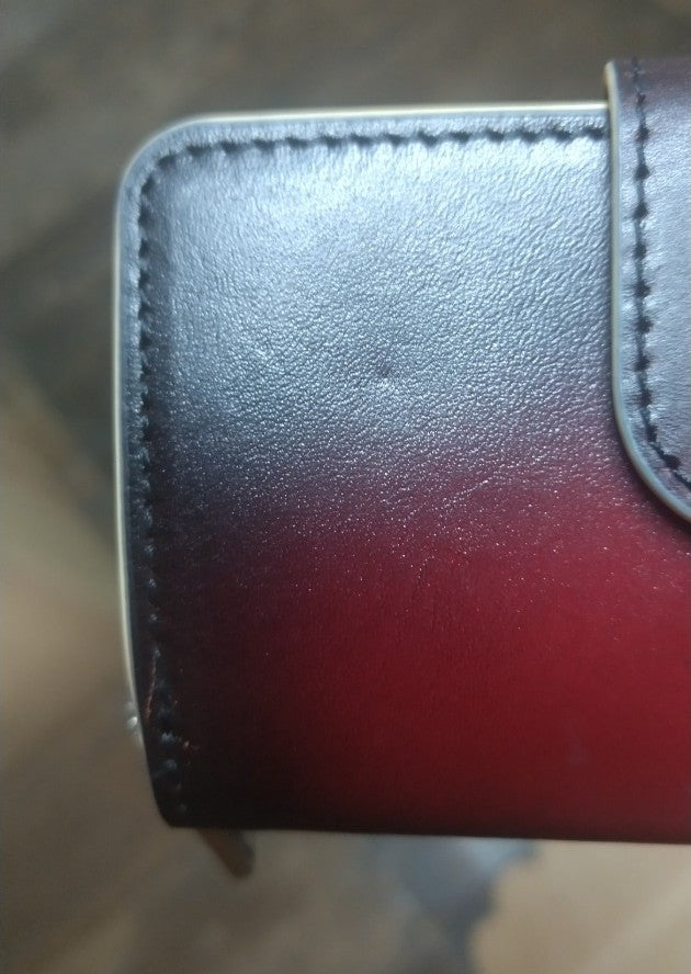 牛革製のコイン&キーケース。裁断したパーツごとにグラデーションして、切り目はベージュの目止め液を塗り、内側にはチョコ色の牛革を使っています。裁断したパーツ一枚一枚に顔料を噴きかけてをかけてグラデーションしています。