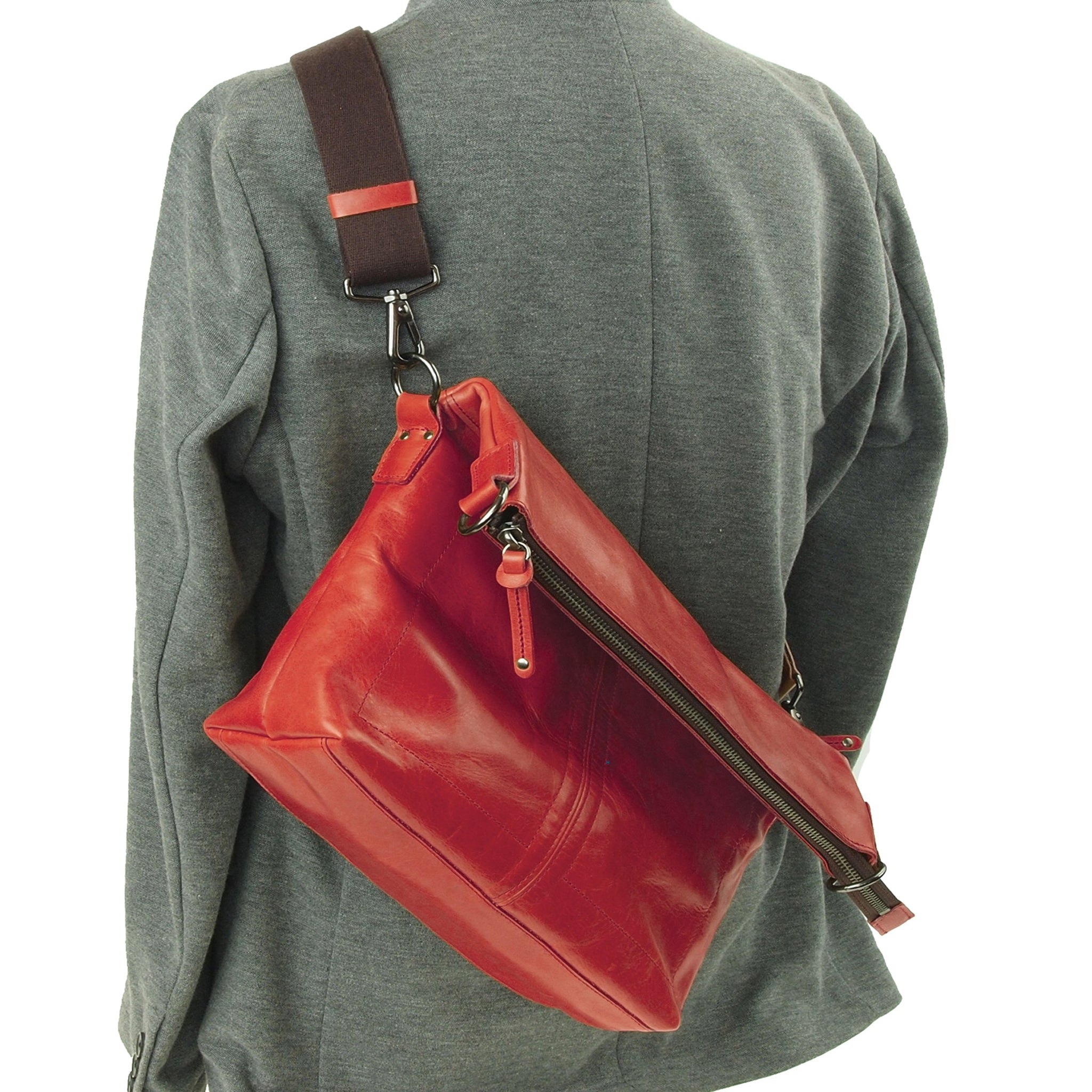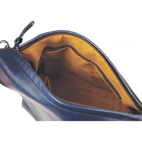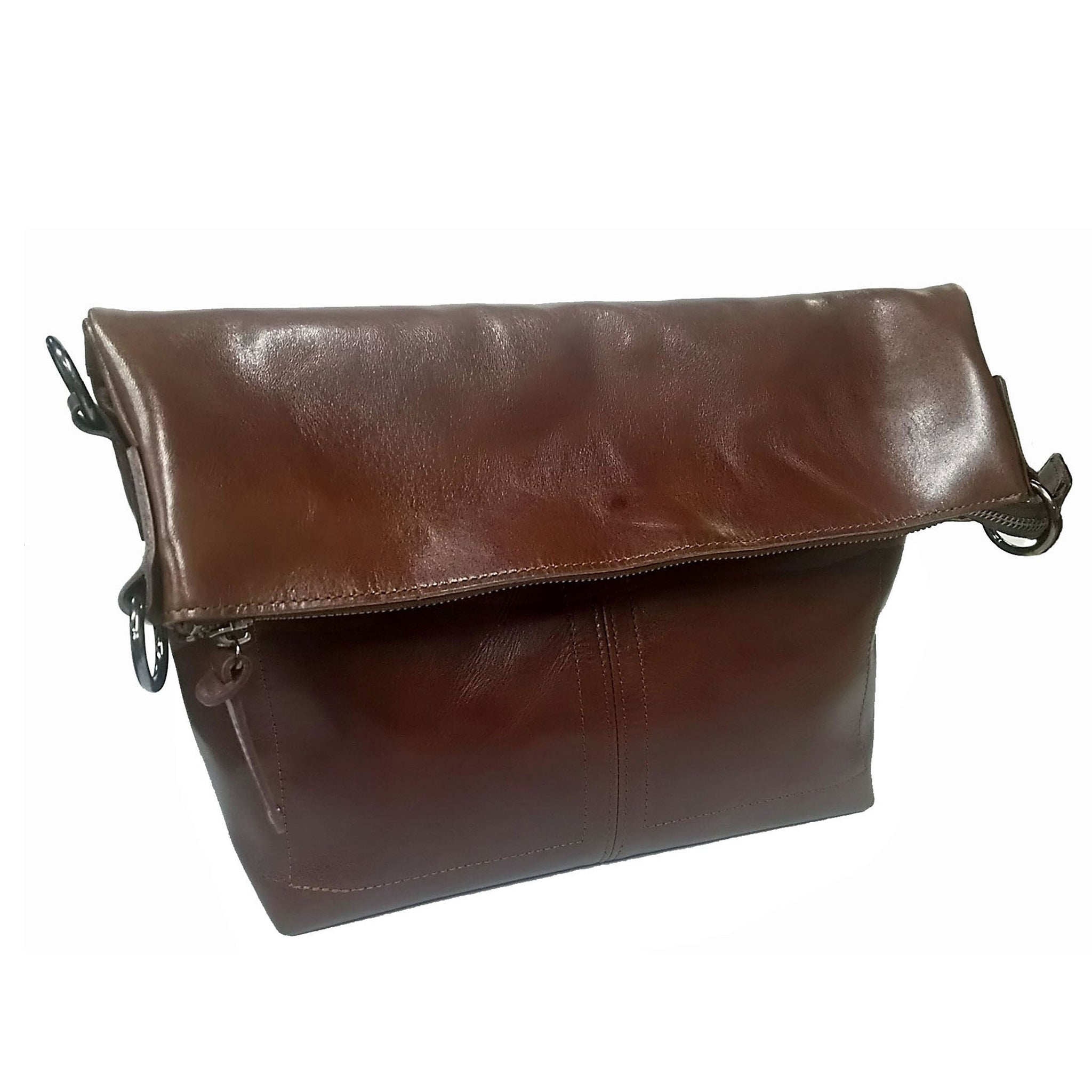 ワックス仕上げの牛革製の口折ショルダーバッグ。