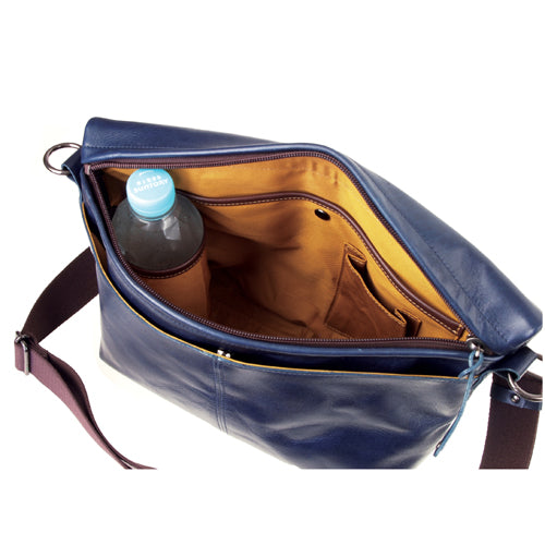 口折れ下の前ポケットは、スマートフォン(携帯)や定期入れが入る大きさで、本体内部には多目的ポケットやボトルホルダーなど充実したショルダーバッグです。